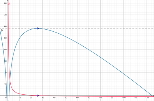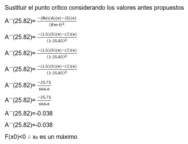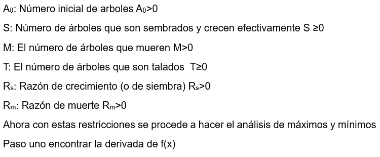 El punto es un máximo, puesto que antes de ese punto en las abscisas la función estaba en crecimiento y luego del punto decrece, es decir antes de aproximadamente 26 unidades de tiempo (redondeado) la población de arboles estaba en crecimiento, pero después de 26 unidades de tiempo empieza a decrecer hasta que se empiezan a tener valores negativos o numero de arboles perdidos con respecto del numero de arboles total, a su vez una razón de crecimiento mas alta provoca un numero de arboles mayor mientras que una razón de muerte mayor provoca que el numero de arboles disminuya, de igual manera con el numero de arboles muertos, sembrados y talados.